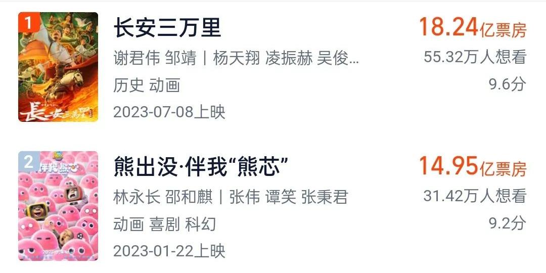 根据灯塔专业版数据,2023年总计有64部动画电影上映,其中国产片38部,港澳台1部,进口片25部。相比2022年的29部、21年的39部,2023年上映动画电影产量较为稳定,但从质量上看,各部动画电影水平不一,整体仍有较大提升空间。