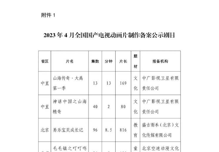 国家广播电视总局办公厅发布了关于2023年4月全国国产电视动画片制作备案公示的通知。