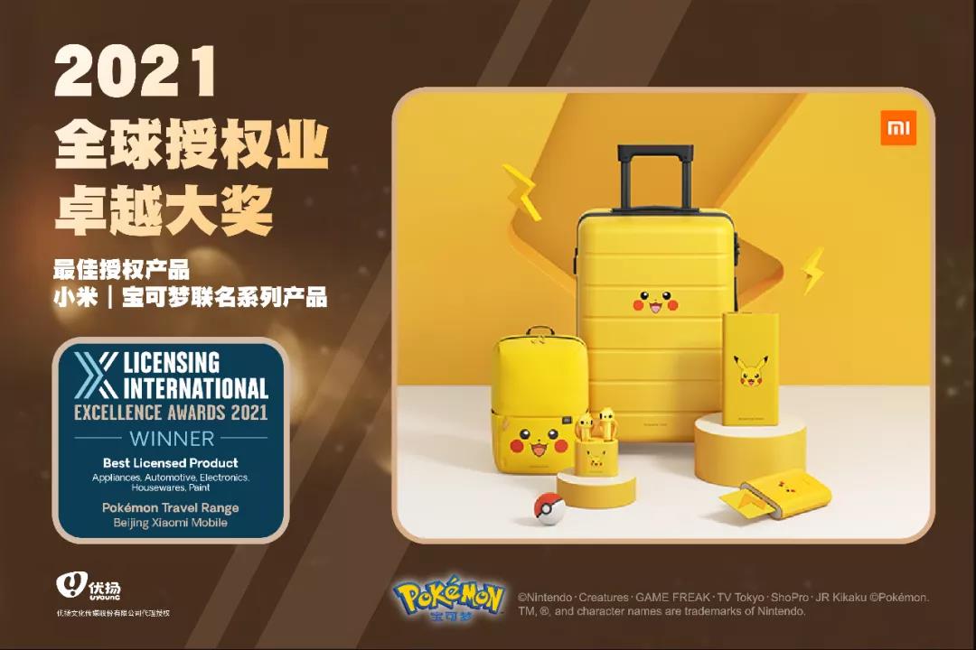 2021年全球授权业卓越大奖受新冠肺炎疫情影响,将颁奖典礼改为线上举办。全球范围内共152个项目入围大奖,只有22位获胜者拿到最终大奖,而今年的颁奖典礼第一次出现了中国企业的身影。经过激烈的角逐,由优扬传媒代理授权的小米宝可梦联名系列产品成功脱颖而出,一举拿下“最佳电子类授权产品”这一奖项。
