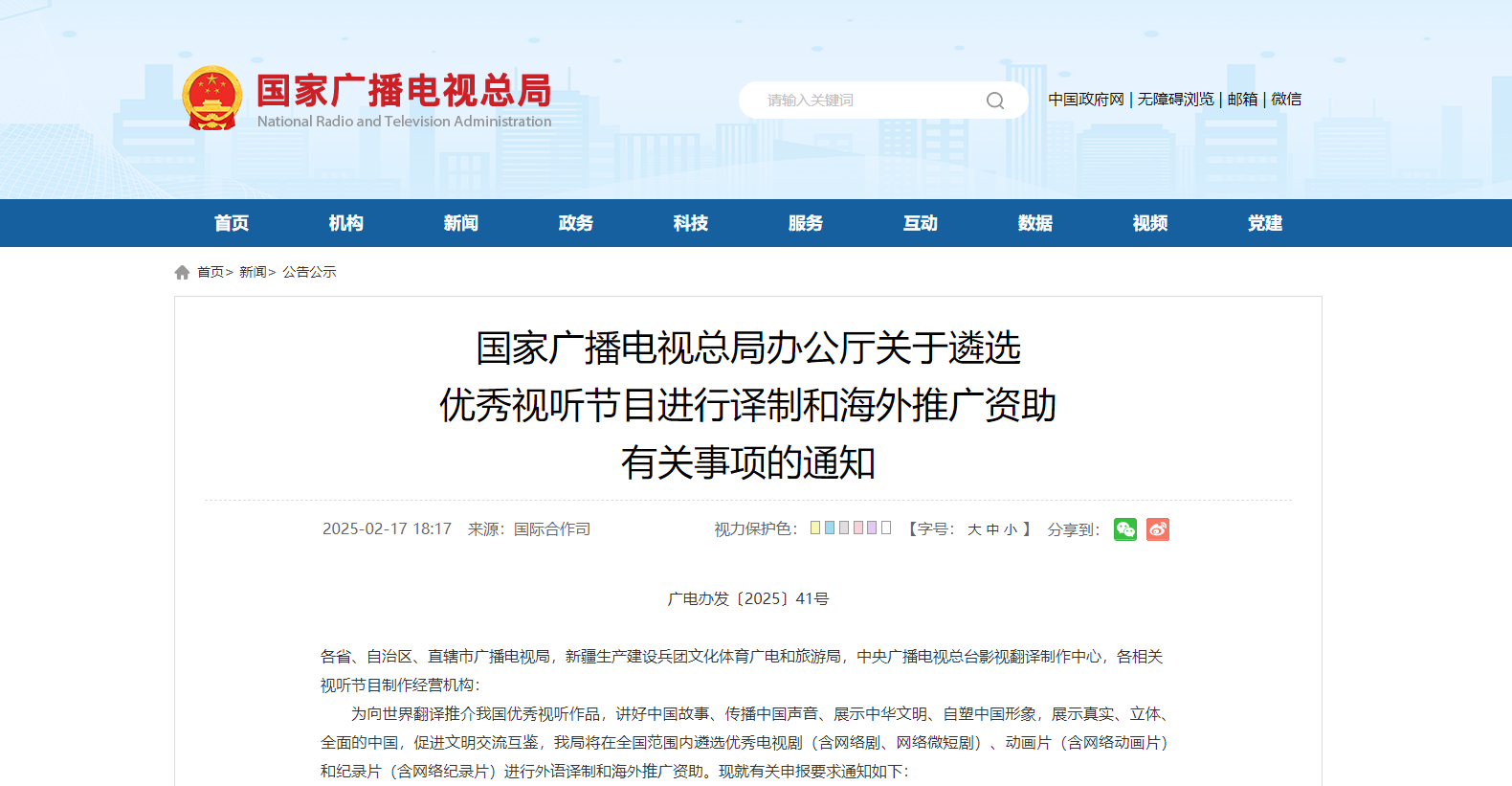 国家广播电视总局将在全国范围内遴选优秀电视剧(含网络剧、网络微短剧)、动画片(含网络动画片)和纪录片(含网络纪录片)进行外语译制和海外推广资助。