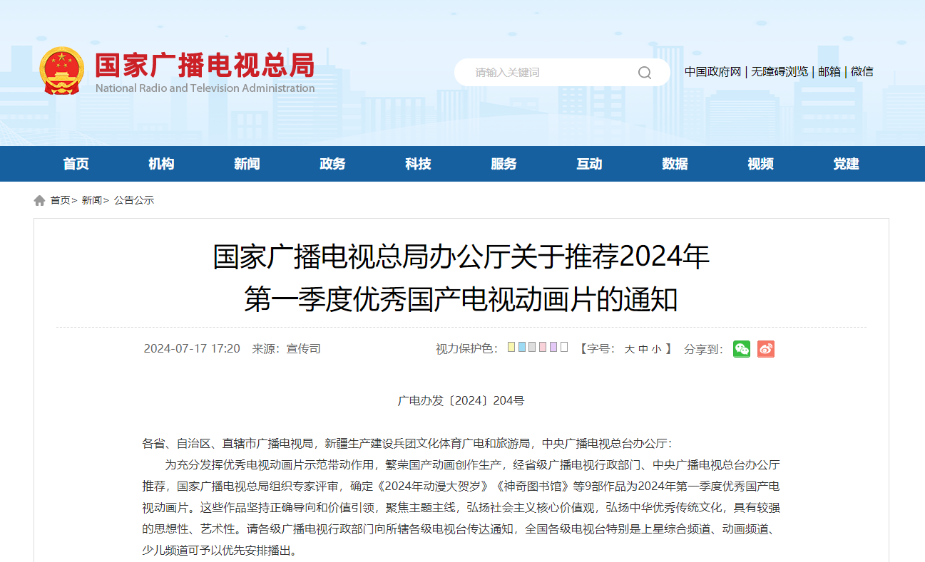 国家广播电视总局组织专家评审,确定《2024年动漫大贺岁》《神奇图书馆》等9部作品为2024年第一季度优秀国产电视动画片。