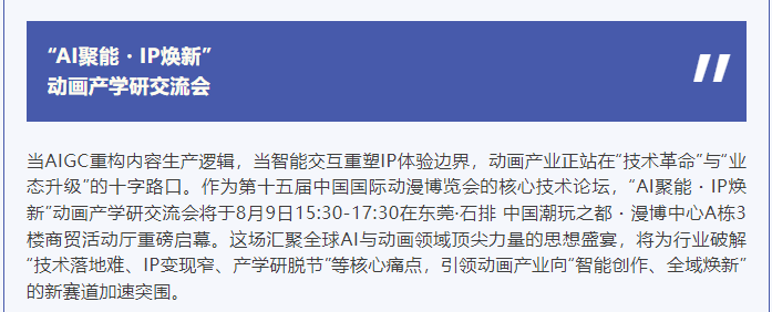 无论你是动画企业决策者、AI技术研发者,还是高校科研人员,这场盛会都将为你搭建交流对接的高端平台。8月9日,东莞·石排 中国潮玩之都・漫博中心A栋3楼商贸活动厅,与行业先锋共探AI时代动画产业的破局之道,共绘动画产业新蓝图,让技术为创意插上翅膀,让IP在智能时代持续焕新!
