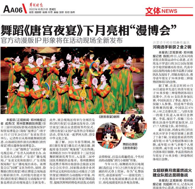 第十三届中国国际影视动漫版权保护和贸易博览会(简称“动漫博览会”)将于11月17日至20日在广东省东莞市举行。记者昨日从郑州歌舞剧院获悉,由该剧院创作演出的舞蹈《唐宫夜宴》将参加该展会。